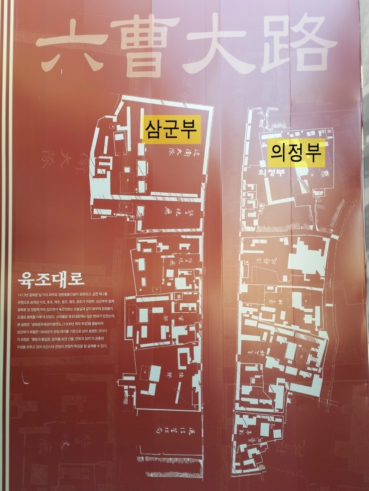 육조대로 : 1413년 광화문 앞 거리 좌우로 장랑건설이 완료되고, 같은 해2품 관청으로 승격된 이조, 호조, 예조, 병조, 형조, 공조가, 의정부, 삼군부와 함께 광화문 앞 장랑에 자리 잡으면서 육조대로는 오늘날과 같이 좌우에 관청들이 도열된 형태를 이루게 되었다.