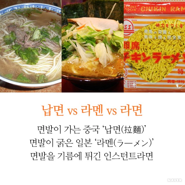 라면은 중국의 납면(拉麵, 중국 발음 라미엔)이 일본으로 전해져 라멘으로, 다시 우리나라로 건너와 라면이 됐다. 납면은 ‘끌어당겨 만든 면’이라는 뜻이다. 칼로 자르지 않고 손으로 길게 뽑아낸 것을 말한다. 우리에게 익숙한 수타자장면이 바로 그것이다.