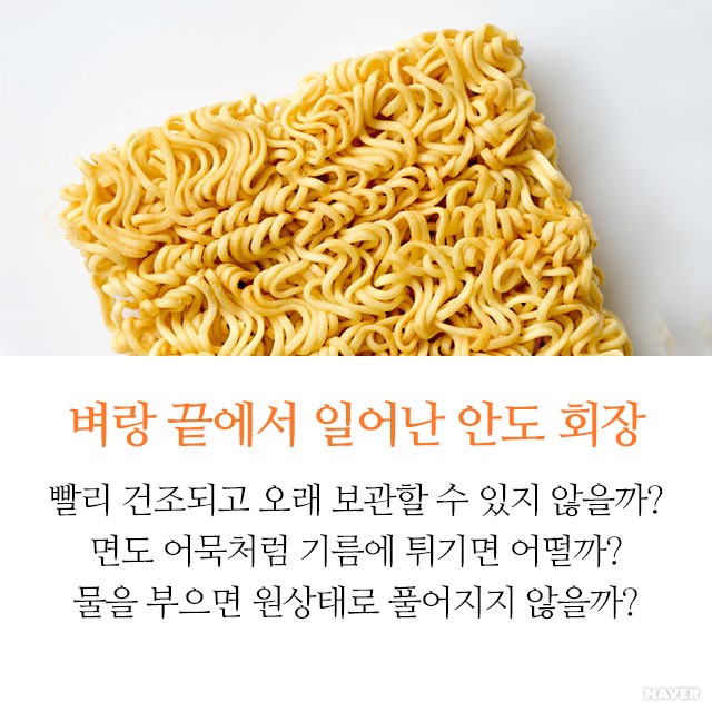 면발은 왜 꼬불꼬불한 걸까. 작은 봉지에 넣으려면 긴 면발보다 최대한 꼬불꼬불 뭉쳐 있는 면이 나을 수밖에 없다. 게다가 꼬불꼬불하면 면이 잘 부서지지 않는다. 조리 시간이 단축되고 면이 더 쫄깃쫄깃해 맛도 더 좋다. 빠른 시간 내에 많은 기름을 흡수해 잘 튀겨진다.