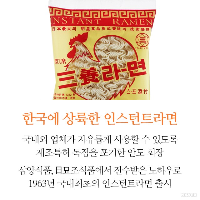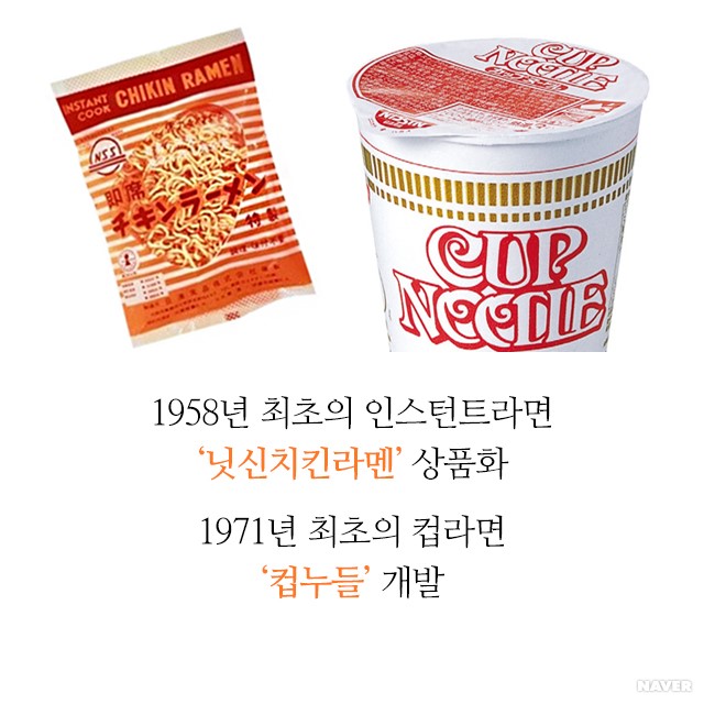 라면은 1958년 8월 25일 안도 모모후쿠(安藤百福, 1910~2007)가 개발했다. 당시 일본은 제2차 세계대전에서 패전한 이후 심각한 식량 문제를 겪고 있었다. 안도가 설립한 닛신식품(日淸食品)이 국수 면발에 간단한 양념 국물을 섞은 아지스케면(味附麵)을 ‘끓는 물에 2분’이라는 캐치프레이즈로 시판한 것이 라면의 시초다. 제품명은 치킨라멘. 뒤이어 1959년 에스코크, 1960년 묘조식품(明星食品)이 가세했다.