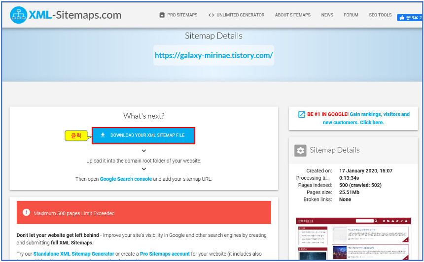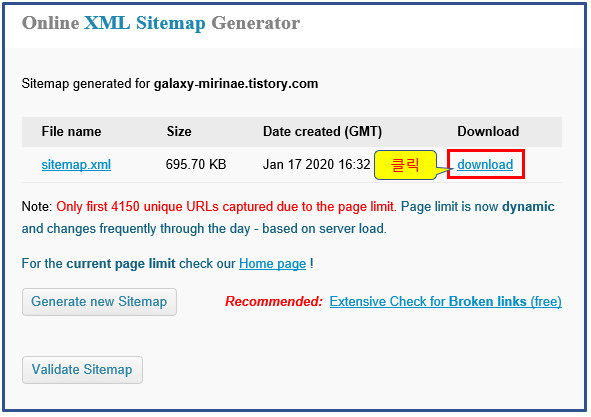사이트 맵 제작이 완료되면 아래와 같은 화면이 표시됩니다. 여기에서는 대략 3분 정도의 시간이 걸렸습니다. 그리고 하단의 Download 버튼을 클릭하면 제작된 사이트 맵을 다운로드받을 수 있습니다.
