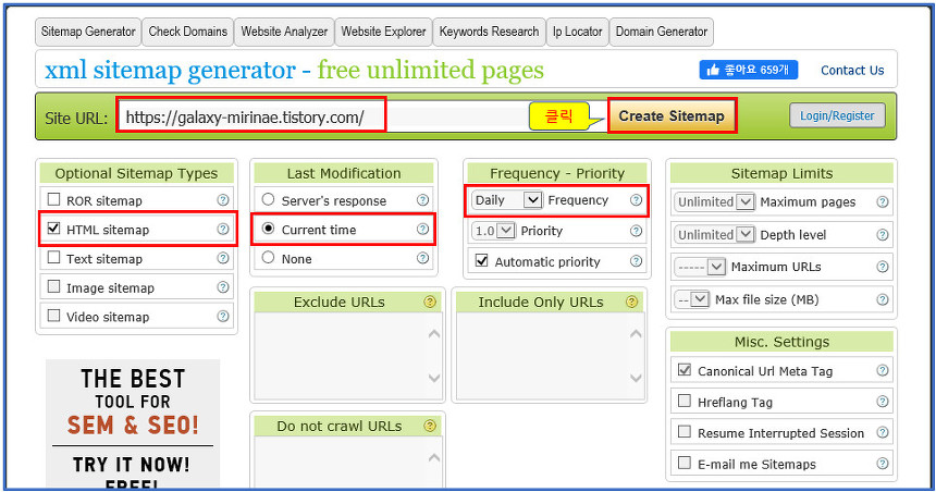 xml sitemap generator에서 사이트 맵 만들기